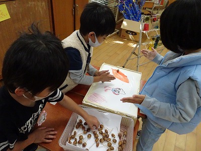 生活科「あきをたのしもう」の学習で、拾ったどんぐりやまつぼっくりを使って、楽しい遊びを考えました。