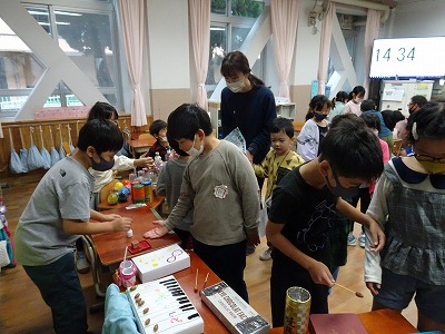 教室では、どんぐりやまつぼっくりを使ったかざりを作った「かざりやさん」、秋のケーキやパフェを作った「おかしやさん」、楽しくリズムを刻む「がっきやさん」のお店を開きました。
