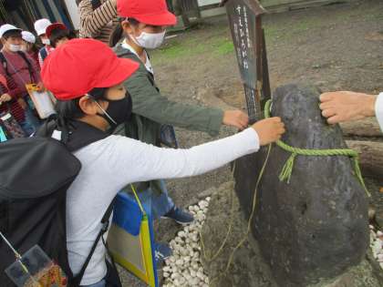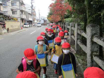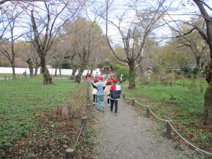 4日(金)に、1・2・よつば学級で遠足に行きました。まず平野神社に行きました。平野神社では、秋見つけビンゴをしました。平野神社で、磁石がくっつく石を触ったり、くすのきの周りを歩いたりしました。
