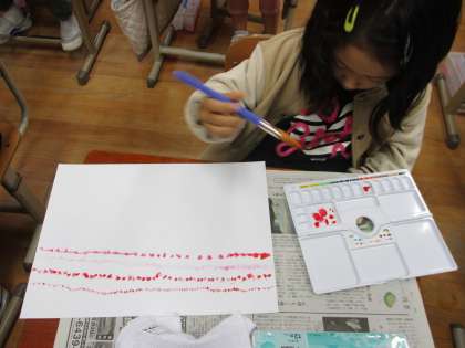 2年生で、絵の具セットを購入したので、使ってみました。新しい用具の名前を覚えて、絵の具をパレットに出してみました。みんな絵の具を楽しんでいました。