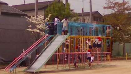 2年生が体育科で遊具で遊ぼうの学習をしたので、3階(3段目)まで、上がっていました。大きな滑り台で滑るのを心待ちにしているようです。