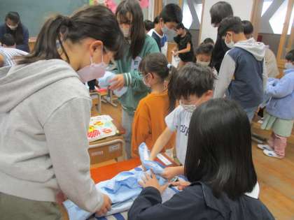 給食の準備の時間は、6年生がエプロンの着方・たたみ方などを丁寧に教えてくれて、1年生も一生懸命がんばっていました。当番ではない子どもたちには、話しかけたり手遊びをしたりして優しく接してくれました。6年生ありがとう!