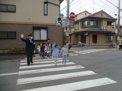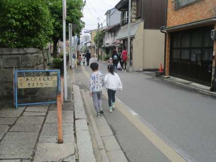 体育館でお話を聞いた後は、実際に学校の近くを歩きました。校門を出るときの左右の確認や、五辻通の交差点の信号や横断歩道の渡り方に気を付けて、安全に歩くことができました。
