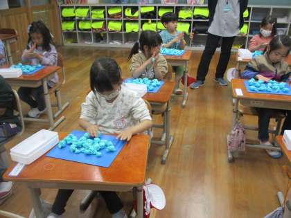 図工の学習ではじめて粘土を使いました。大きなかたまりの粘土をねじったり、ちぎったりしてバラバラにした後は、のばしたりまるめたりして、粘土のたいそうをしました。手の平全体を使って,粘土の感触を楽しみながら活動していました。
