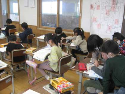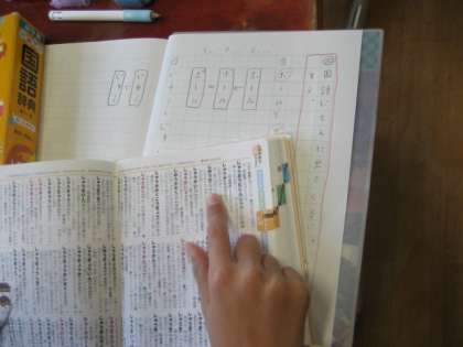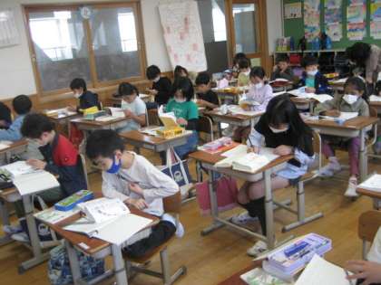 国語辞典を使って、「じゆう」と「じゅう」「くらす」と「クラス」など、どちらの言葉が先に出てくるかを調べました。子ども達は、班の友達に教えたり教えてもらったりしながら楽しく辞典を使って探していました。