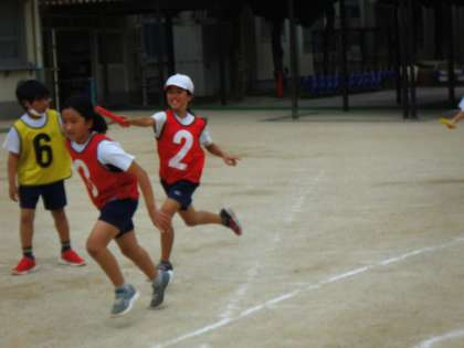 チームの50m走の合計タイムを目標タイムとして、リレーの学習をがんばっています。後ろを見ないで、思いっきり飛び出すことができるチームが増えてきました。声を掛け合って、チームのメンバーを信じて、ますます練習します。