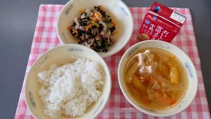 豚肉と野菜(小松菜・にんじん・たまねぎ・しょうが)をいため、暑い季節に食べやすいように、梅干を使って、さっぱりとした味つけになっています。
