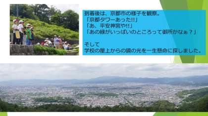 大文字山への社会見学の様子です。残念ながら写真では学校からの鏡の光は映っていませんが、何人かの子どもたちはキラキラ光る教頭先生からの合図を見つけられたようでした。