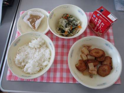 今日の給食の目玉は「ういろう」でした。米粉、黒砂糖、砂糖を混ぜたものを調理員さんがひとつずつカップに入れて、それをスチームコンベクションオーブンで蒸して作りました。やさしい甘みでとてもおいしかったです。