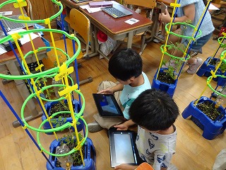 小さな小さな実を見つけて,「赤ちゃんみたいなミニトマトができてる!」「ビー玉くらいの大きさまで育っている!」と嬉しそうに観察していました。