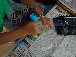 図画工作科「光のプレゼント」の学習で,光を通す透明の材料に,油性のマジックでペットボトルや容器に,模様や生き物を描きました。