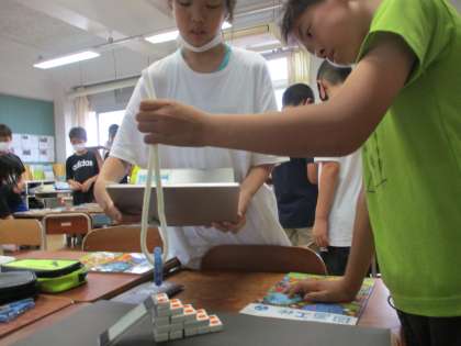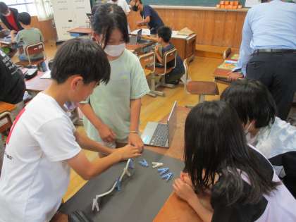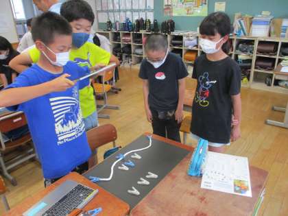 図画工作科では、「形が動く 絵が動く」という単元の学習をしています。材料を動かしたり形を変えたりした写真を連続で表示すると、まるで動いているように見えることを学び、班ごとにタブレット端末でアニメーションを作りました。