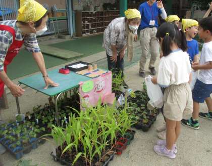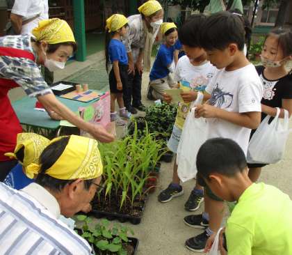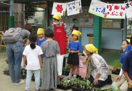 翔鸞幼稚園のお友達に招待してもらい、花や野菜の苗をもらいました。チケットを持っていき、3種類の苗をもらうことができました。子どもたちは朝からワクワクしていて、「たくさんあってまよう・・・。」と言いながら楽しそうに苗を選んでいました。苗の成長が楽しみですね。