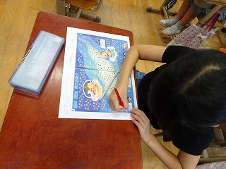 プリントには、夜空に織姫様と彦星様、そしてたくさんの星の絵が描いてあります。