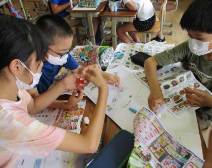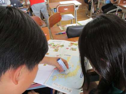 社会では、「くらしを支える食料生産」の学習をしています。今日は、スーパーマーケットのちらしを家から持ちより、産地を確認して地図の都道府県の上にはってみました。すると、野菜や牛肉などの生産量が多い都道府県が分かりました。調べ学習を進める中で、「なぜ牛肉は国産と外国産があるのか。」、「なぜ食べ物によって産地に偏りがあるのか。」などの疑問が生まれました。