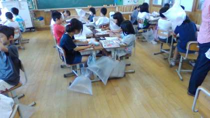 空気を袋に閉じ込めました。その手ごたえについて話し合っています。なんとなくやわらかい、というイメージがありますが、もっともっと強く押してみると、やわらかいだけの手ごたえではないようです。