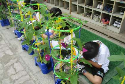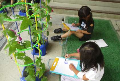 生活科で育てているアサガオの花が咲き始めました。今日は、アサガオの花を観察して「みつけたよカード」に記録しました。アサガオの花の奥の方をじっくり観察したり、つぼみをみつけたり、これからの成長もとても楽しみにしている様子でした。