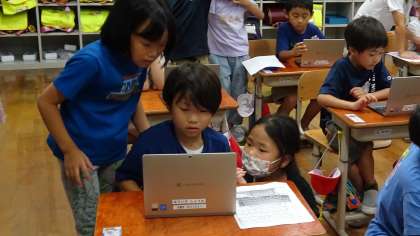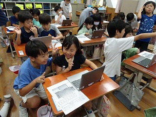 教えるのはちょっとドキドキ…の2年生でしたが、優しくボタンの場所を伝えたり、お手本を見せてあげたり、一生懸命伝えていました。