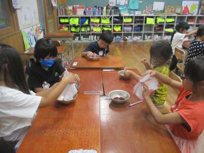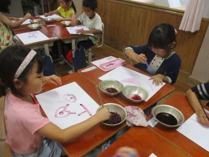 今日は、夏休みの間もきれいに咲き続けたアサガオの花を使って色水遊びをしました。濃いむらさき色のきれいな色水ができると、みんなとても嬉しそうでした。できた色水を使って和紙に模様をつけたり、画用紙に絵を描いたりしました。一回目は色水をつけすぎて和紙が破けてしまった子もいましたが、二回目は和紙につける色水の量を調節していました。いろいろな模様ができて、とてもきれいでした。
