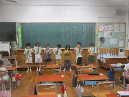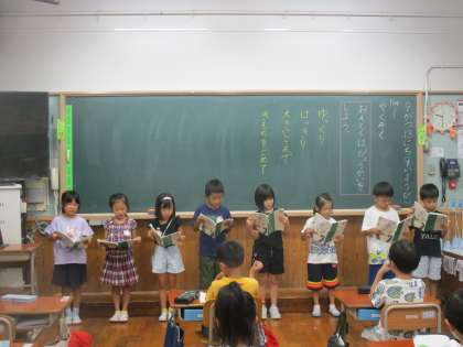 「やくそく」というお話の音読発表会をしました。グループの中でナレーター、あおむし、木の役に分かれて音読練習をしていくうちに、みんなとても上手に読むことができるようになってきました。発表会でもゆっくり、はっきり、大きな声で、気持ちをこめて読んでいました。
