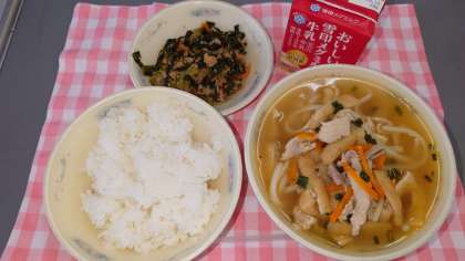 うどんをよりおいしくするために、「鶏肉」「油あげ」「にんじん」「細ねぎ」「干しいたけ」など、たくさんの食材を加えました。まさに加役ですね。