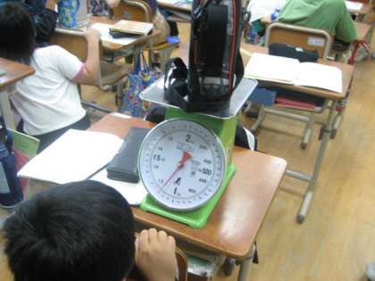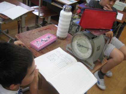 身の回りの物の重さを予想して図る学習をしました。前時に学習した1キログラムの量感をもとに重さを予想していました。はかりのメモリを読むときは、メモリを正面から見て正しく読むことができるようになりました。