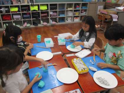 いろいろな食べ物の形を思い浮かべて、油粘土で作りました。丸めたり、伸ばしたり、ねじったりしながら、表し方を工夫していました。ケーキやパフェ、おすしなどのごちそうが出来上がって、みんなとても嬉しそうでした。