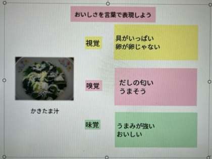予習として子どもたちは、料理を味わう際、五感を使って感じたことを自分の言葉で表現する練習しています。