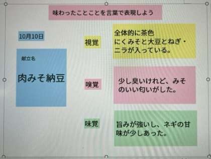 春巻き、かきたま汁、肉みそ納豆など、毎日の給食を自分なりの言葉で表現できています。