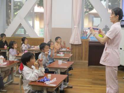 歯科衛生士さんに来ていただいて、歯の学習をしました。歯の働きや、虫歯にならないような生活、歯の磨き方などを教えていただきました。最後は、お手本の歯の磨き方を見て、歯ブラシの当て方を変えながら丁寧に歯を磨いていました。今日教えていただいたことを、おうちでも実践できるといいですね。