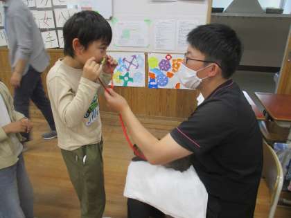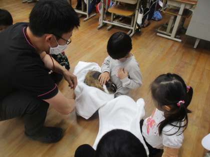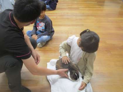 今日は獣医さんに来ていただいて、生き物の学習をしました。子供たちの質問に答えていただいたり、ウサギを抱っこしたり、聴診器で自分やウサギの心臓の音を聞いたり、様々な体験をしました。一人ずつ膝の上で抱っこする活動では、「かわいいなあ。」「鼻がぴくぴくしてる。」と言いながら、優しくなでていました。触れ合いを通して子どもたちは、ウサギも命を持つ生き物であることを実感していました。これからも生き物を大事にしてほしいと思います。