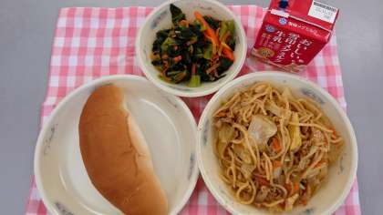 給食では、豚肉・たまねぎ・にんじん・キャベツを使い、ソースで味付けしました。