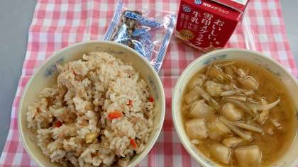 今日の「炊きこみ五目ごはん」は、学校で保管しておいた米(アルファ化米)とまぐろフレーク・たけのこ・しいたけ・乾燥したにんじんを使っています。給食室の大きな釜で炊きました。