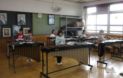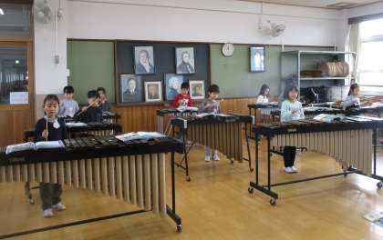 鉄琴や木琴などの鍵盤打楽器に触れるのは初めてだったので、始めは二人組で音の場所を教え合ったり、交代で演奏したりしながら練習しました。鍵盤ハーモニカとの合奏でも、階名で歌いながら上手に演奏することができました。