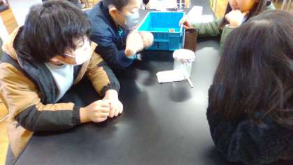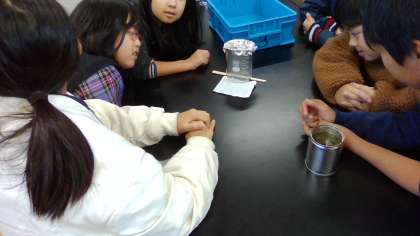 今日もすごい冷え込みでした。教室をあたためたいのですが、空気はどのようにあたたまっていくのでしょう。空気の流れが見えるように、線香のけむりをビーカーにため、けむりの様子を観察しました。どうやらあたたかい空気は上に行くようです。では、教室や部屋を温めるためには、どのようにすれば効率よくあたためることができるのでしょう。