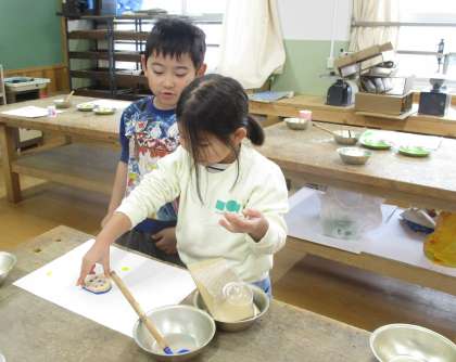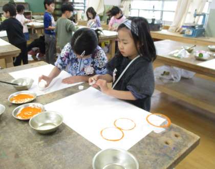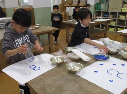 身近な材料や野菜の切れ端などに絵の具をつけて、かたちをうつす活動をしました。「カニのあしみたい。」「かたちをかさねたら、おもしろいもようになった。」など、素材の特徴を生かして、いろいろな形ができる面白さを味わいながら、楽しく画用紙にうつしていました。
