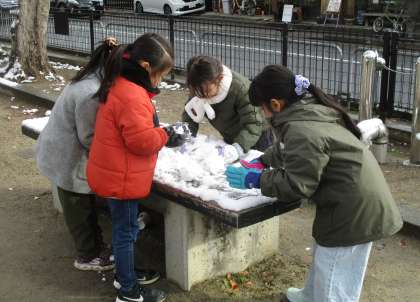 今日は、おとなりの翔鸞公園に行って、雪あそびをしました。地面の雪はほとんど溶けていたので、ベンチや遊具に積もっている雪をさわったり、あつめたりして雪と触れ合う活動を楽しみました。「さらさらしてるけど、あつめたらかたくなった。」「大きな雪玉ができてうれしかった。」など、手がつめたい・・・と言いながらも元気いっぱい活動していました。