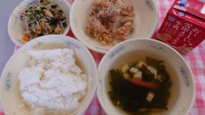 「鶏肉のこはくあげ」は、味がよくしみこむように、みじん切りにしたしょうがと料理酒、醤油をつかって下味をつけました。しょうがの香りを楽しみながら、いただきました。
