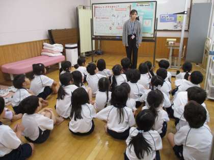 保健室の先生から、保健室の使い方や傷の洗い方などたくさんお話を聞きました。