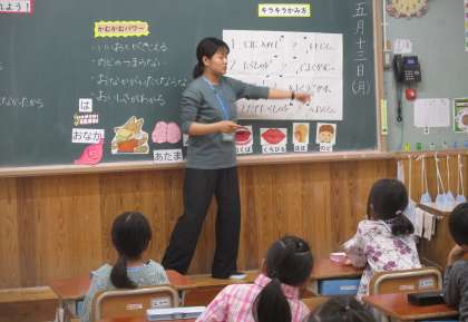 栄養教諭の先生と、食の学習をしました。紙芝居を見て、しっかり噛むことの大切さについて考えたり、正しい噛み方を知って二人組で確認し合ったりしました。体に良い噛む回数「30回」を意識して、給食でもしっかり噛みながらおいしそうに食べていました。