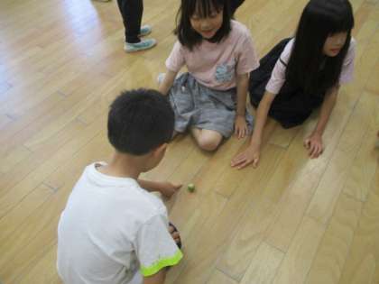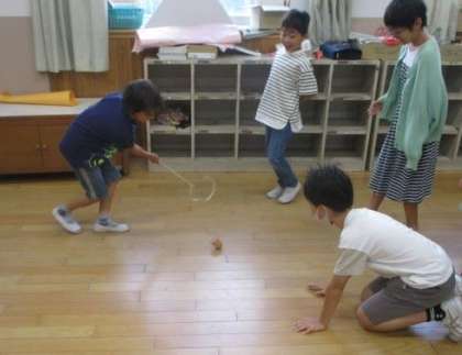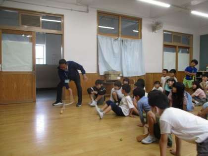 今日、回したこまは、『たたきごま』と『さかだちごま』の2種類です。どちらのこまも簡単には回すことはできませんでしたが、友だちにアドバイスをもらったり、励ましてもらったり、ゲストティーチャーの教頭先生からコツを教わったりしながら、だんだん上手に回せるようになってきました。