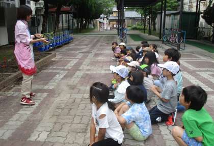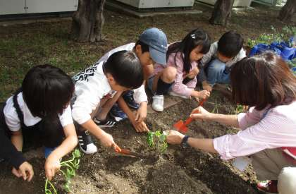 2年生の花壇に、サツマイモの苗をうえました。平田先生から苗のうえ方を教えていただいた後、二人で一つの苗を丁寧に植えていきました。収穫は秋になりますが、みんなで成長の様子を見守っていきたいと思います。