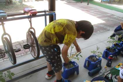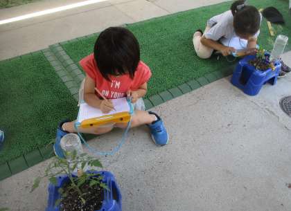 観察記録文を書くために、ミニトマトを観察して、見つけたことや気づいたことをメモしました。はっぱが増え、黄色いかわいい花も咲き始めています。においを嗅いだり、さわってみたり、丁寧に観察することができました。