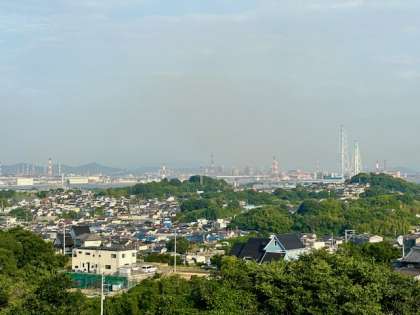 部屋からの眺望。遠くに水島コンビナートが見えます。