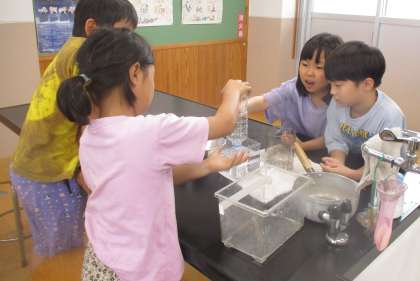 今日は、理科室でいろいろな入れものにはいるかさを予想してはかる活動をしました。はじめに、ILはどれぐらいかを考えてバケツに水をいれてみました。1Lのますに水をうつしかえてみると、どの班も1Lに近いかさだったので、驚いたり、喜んだりしていました。その後で、なべやボウルなどの入れ物のかさを予想してかさをはかっていきました。みんなで協力しながら,水をいれたりうつしたり,テーブルをふいたり・・・。生活の中でも、Lやmlの表示に気づいたり、かさの量感が身についていったらいいなと思います。