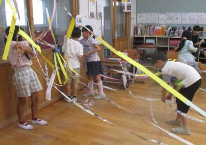 細い紙をつないだり、つるしたりして思いついたことをつくる造形遊びをしました。「みんなでつないだら楽しい。」「もっとつなぎたい。」「トンネルみたいになった。」など、おもしろい形を見付けたり、つくったものの面白さに気付きながら、楽しく活動していました。