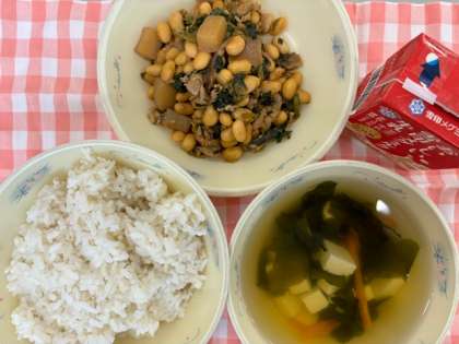 「肉みそいため」は、大豆やこんにゃくなどの食感やみその甘辛い味つけを楽しんでいただきました。