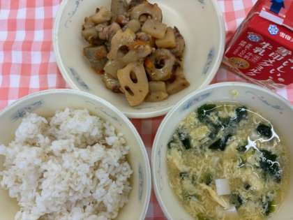給食では、にんじん、れんこん、ごぼうなどの根菜類と鶏肉、ちくわ、こんにゃくを使っています。