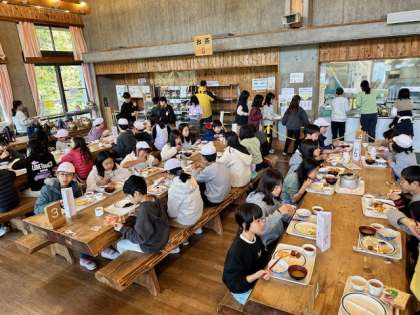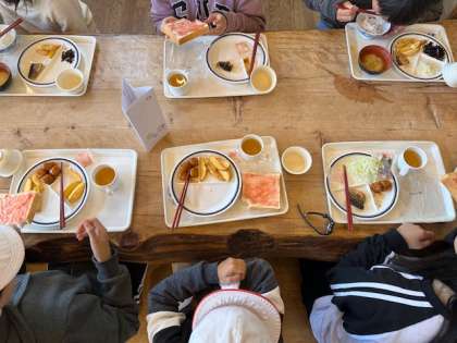 シーツを畳んで部屋を綺麗に後片付け。ホールで今日の活動について確認した後、朝食で腹ごしらえをします。