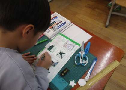 今週から、窓が開く仕組みから思いついたものをつくる学習を始めました。カッターナイフを使うのは久しぶりだったので、使い方を思い出しながら、練習シートでいろいろな線を切る練習をしました。その後、シートにかかれている窓の線を切って、窓が開く仕組みを作って、絵を描いた紙を裏からはっていきました。何度も窓を開いて絵を確認したり、友達と見せ合ったりして、とても楽しそうでした。来週からは、本格的に作品作りを始めます。どんな作品が完成するのか、楽しみです。
